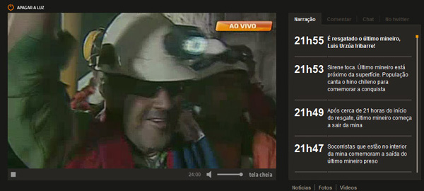 Pelo portal Terra, pude ver a partir do resgate do 32º mineiro confinado, Ariel Tirona, o encarregado das comunicações com o exterior -entre sorrisos, abraços, lágrimas e aplausos: às 21:28.