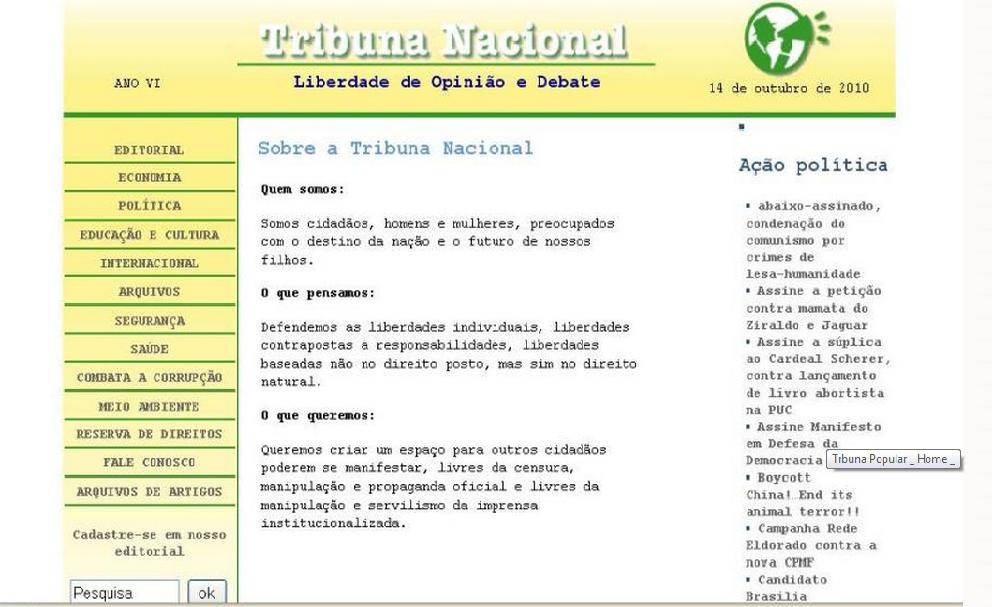 A notícia está no blogue pernambucano Acerto de Contas e foi levantada por André Raboni, que foi conferir o baú das calúnias contra Dilma Roussef, que se valia do no correio eletrônico. Denunciado pelo jornalista investigativo Tony Chastinet, o sítio Tribuna Nacional (ao lado) era editado por Nei Mohn, ex-presidente da Juventude Nazista, em 1968 – tempos obscuros da ditadura. Descoberto, fez como os ratos de esgoto, que não podem ver a luz: fugiu.