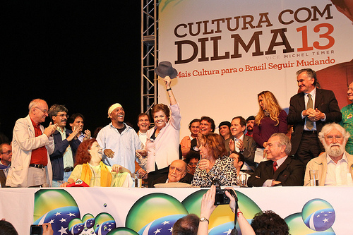 Cercada e aplaudida por por dezenas de celebridades das artes e das letras, e ovacionada pelo coro de vozes que cantavam olê, olê, olê, olá, Dilma, Dilma…!