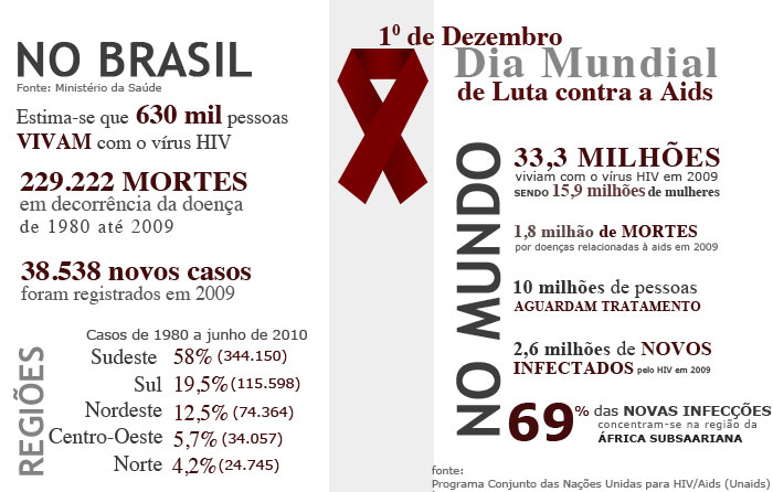 Hoje Dia Mundial de Combate à Aids. Dados do Ministério da Saúde, divulgados nesta quarta, deixam em estado de alerta, principalmente, jovens e mulheres. O estudo mostra tendência, preocupante, de crescimento no índice de contaminação neste segmento. Cerca de 630 mil brasileiros vivem com HIV em todo o país, segundo o Ministério da Saúde. Desses, 255 mil não sabem que foram infectados (quadro abaixo).