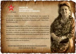 De volta ao assunto principal, Anita Soares Dulci filiou-se ao PT desde a sua fundação. Contribuiu, decisivamente, para o crescimento do partido em Santos Dumont, na Mata Mineira, onde foi candidata por duas vezes. Faleceu em 21 de janeiro de 1998, aos 72 anos, e foi enterrada com a bandeira petista.
