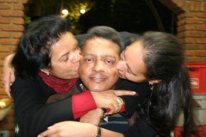 Primo Wanderley acarinhado pela prima-esposa, Lourdes, e Lela, a caçula dos quatro que o casal gerou e criou. Foto: álbum de família