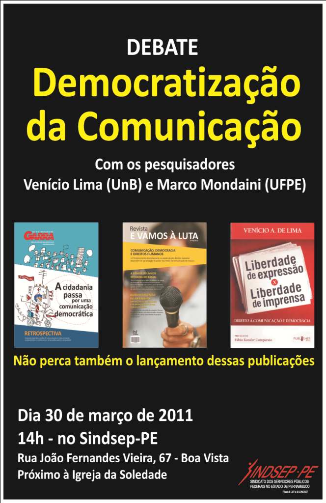 O Fopecom – Fórum Pernambucano de Comunicação promove, dia 30, debate sobre Democratização da Comunicação. Participam os pesquisadores Venício Lima, da Universidade de Brasília e Marco Mondaini, da Universidade Federal de Pernambuco. Às 14 horas, no auditório do Sindsep -Rua Fernandes Vieira, 67 – Boa Vista.