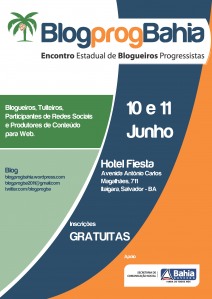 O BlogProgBahia terá Paulo Henrique Amorim, do Conversa Afiada, na abertura, no Hotel Fiesta, em Itaiguara, Salvador. Altamiro Borges, Blog do Miro – SP, Sérgio Telles, a jornalista Paula Marcondes, da Rede Liberdade SP e o ator José de Abreu debatem Militância Digital no sábado. O professor Marcos Dantas, de Comunicação na PUC-Rio também é convidado – para debater Banda Larga, dentre outros. Eis a programação.