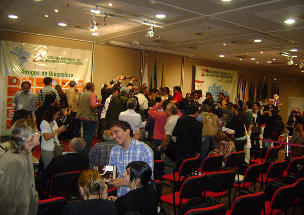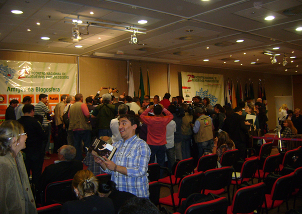 Adiciono as fotos que tirei no 2º Encontro Nacional de Blogueiros Progressistas. Quando Lula encerrou a palestra de abertura, foi envolvido por uma verdadeira tsunami humana. Blogueiros e blogueiros “sujos”, ansiosos por um afago do Nunca Dantes Nesse País. E também, claro, pela mídia, que lá estava em peso.