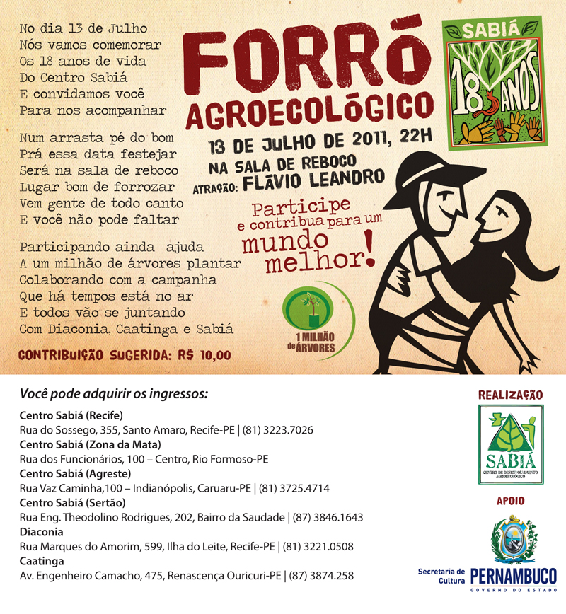 O Centro Sabiá de Desenvolvimento Agroecológico completa 18 anos e, embora já tenha nascido no ponto, comemora a maioridade com um baita forró, nesta quarta, 13. A partir das 22hs, na Sala de Reboco, no Cordeiro, Zona Oeste do Recife. Fábio Leandro garante o remelexo. Quem for contribui com 10 reais – você pode dar mais se puder e quiser – para o plantio de 1 milhão de mudas de árvores, campanha em parceria com as ONGs Diaconia e Caatinga.