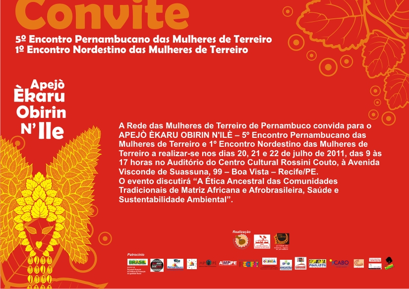 As Mulheres de Terreiro do Nordeste têm encontro marcado nesta quarta-feira, no auditório do Centro Cultural Rossini Couto, na Boa Vista, a partir das 9 horas. É quando começa o Apejò Èkaru Obirin N’ellè – 5º Encontro Pernambucano das Mulheres de Terreiro e 1º Encontro Nordestino de Mulheres de Terreiro.