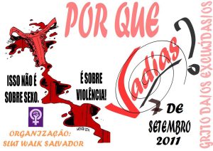 Em Salvador, a Marcha das Vadias volta às ruas, em protesto contra a violência sexista. Não é sobre sexo, é sobre violência contra as mulheres. Concentração às 8:30, no TCA – Teatro Castro Alves, perto do Beco dos Artistas. Levem seus cartazes, convoca Sandra Munhoz, da Articulação Baiana de Mulher e Mídia e do Movimento de Lésbicas e Mulheres Bissexuais da Bahia.