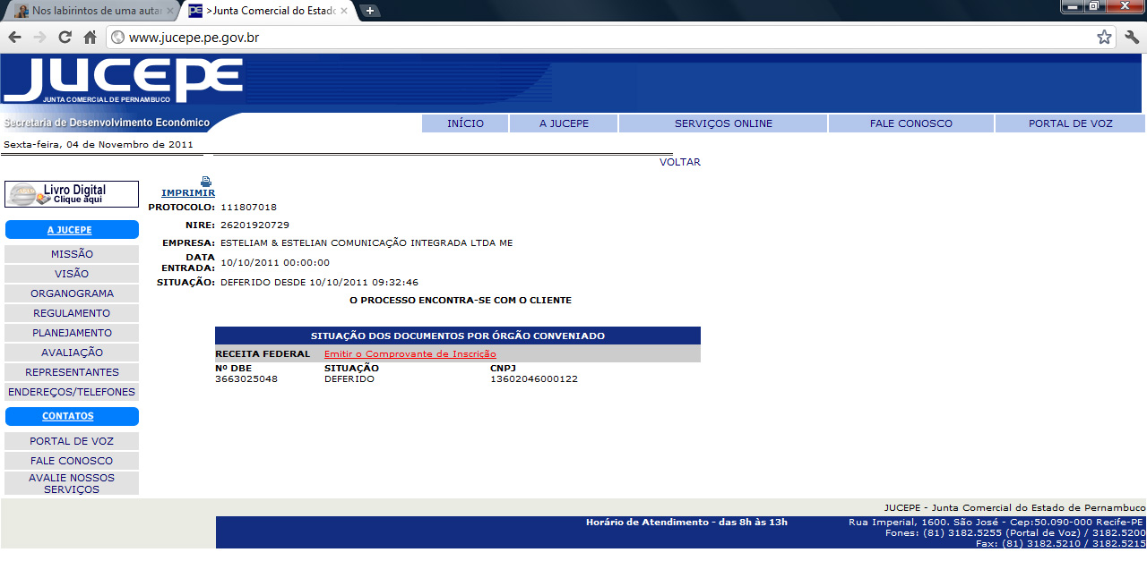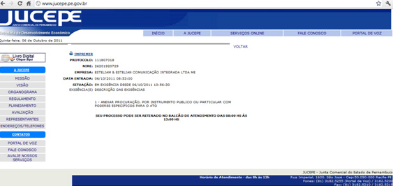 Hoje voltei à Jucepe – Junta Comercial, levando a procuração específica da minha filha-sócia, exigida em 06.10 – conforme mostrado na postagem acima referida e ao lado -, e que aproveitei para trazer de Beagá. Para minha surpresa e alegria, o processo estava concluído (clique na imagem para visualizar melhor):