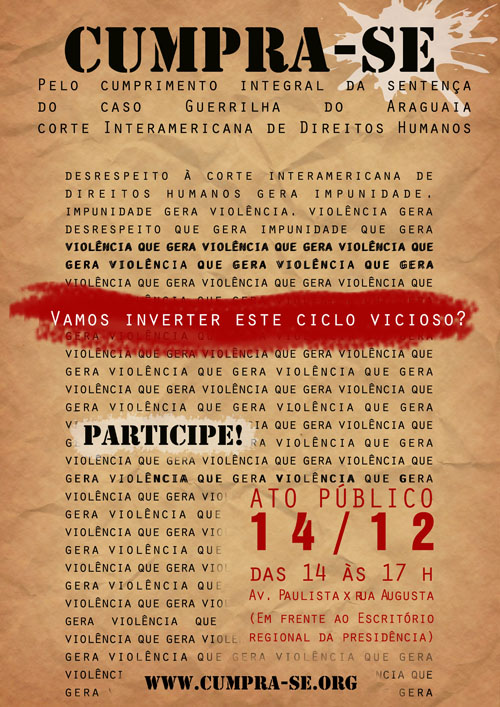 Na quarta-feira, 14, é dia de protesto em defesa dos direitos humanos e pelo cumprimento integral da sentença da Corte Internacional dos Direitos Humanos da OEA – Organização dos Estados Americanas, que determina que o Brasil reveja a Lei da Anistia para punir os torturadores da ditadura. Nesse dia vence o prazo dado ao governo brasileiro.O ato será em São , a partir das 14 horas (ao lado).
