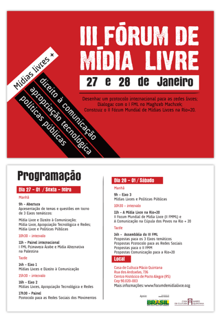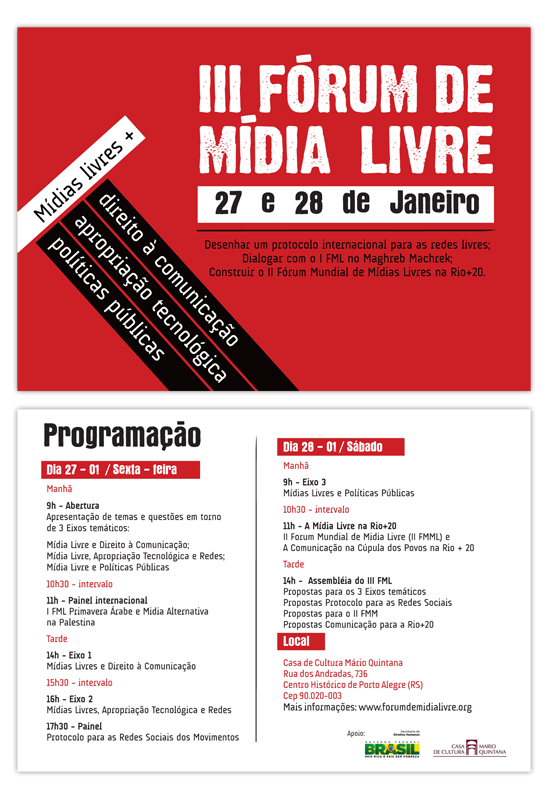 Acontece na sexta, 27 e no sábado, 28 em Porto Alegre, o III Fórum de Mídia Livre, evento paralelo ao Fórum Social Temático 2012, aberto ontem, e que segue até o domingo, 29 – aqui, no blogue. Os debates se dão em torno de três eixos temáticos: direito à comunicação, apropriação tecnológica e redes e políticas públicas para midias livres.