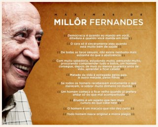 O amigo jornalista e poeta, Carlos Barroso, me envia das Gerais homenagem a Millôr Fernandes, que foi habitar as estrelas, semana passada. Publico a seguir, em segunda, mas necessária mão; a primeira, conta o autor, foi há dois anos no Cometa Itabirano, o alternativo mais longevo destas plagas – já passa dos 30. A imagem ao lado foi capturada no Facebook, postada pela também jornalista mineira, Valéria Said, e compartilhada por esta reles blogueira, dia 29 de março.