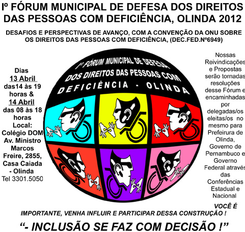 Em Olinda, começou nesta sexta à tarde, e rola todo o dia de sábado, o 1º Fórum Municipal em Defesa das Pessoas com Deficiência, no Colégio DOM, em Casa Caiada – convite acima. As resoluções do fórum serão levadas pela delegação eleita às conferências públicas nos três níveis de governo: municipal, estadual e federal.