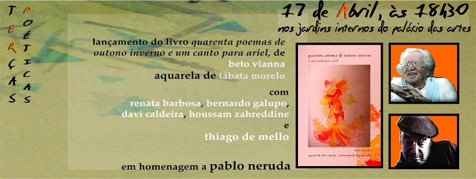 Há dias, o amigo mineiro Beto Vianna, companheiro das páginas do Cometa Itabirano, deixou um convite no Facebook para lançamento de seu primeiro livro de poesias. Ando meio enrolada com o calendário, mas ainda é tempo: é nesta terça, 17 – quando minha Gabi-Gabriela faz aniversário – às 18:30, nos jardins internos do Palácio das Artes, em Beagá. Com leitura de poemas por Thiago de Mello, o Poeta das Florestas, e homenagem a Pablo Neruda; um luxo só.