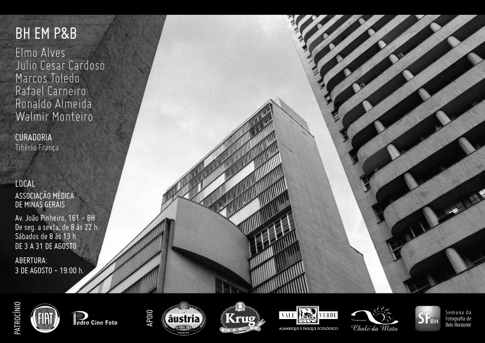 Quem é de Beagá, ou está em, anote: o convite acima me foi enviado, via correio eletrônico, pelo amigo Ronaldo Almeida. Trata-se, como se pode ver, de exposição de fotos da minha cidade, em preto e branco, que abre ao público nesta sexta, 03, na Associação Médica de Minas Gerais. Coletiva que reúne seis fotógrafos, dentre eles, o autor do convite, parceiro das lides jornalísticas de antanho.