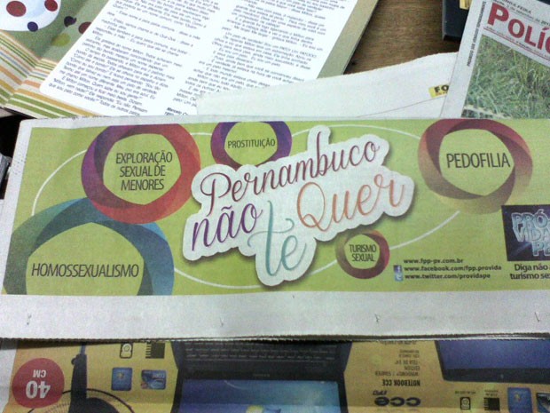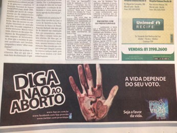 Embarco, não obstante, noutro viés: situar as atitudes diversas dos jornais, pegos no contrapé pela reação social aos dois anúncios, publicados à guisa de alerta ao voto nas próximas eleições. Ambos aceitos por seus departamentos comerciais, e cada qual publicado, o homofóbico na edição da última segunda-feira da Folha de Pernambuco; o anti-aborto na edição do domingo, 02, do Diário de Pernambuco.