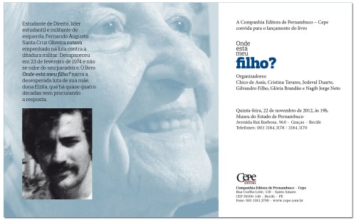 O convite, que ilustra esta postagem, me chegou via correio eletrônico, duplamente: de parte de Marcelo Santa Cruz, vereador pelo PT de Olinda e membro do Movimento Nacional pelos Direitos Humanos – filho de dona Elzita e irmão de Fernando Santa Cruz; e do amigo jornalista e homem de rádio, Ruy Sarinho, criador, produtor e diretor do programa Violência Zero, e com quem tive a honra de dividir a bancada de apresentação, pela Rádio Olinda AM, durante sua efêmera ressurgência, em 2010.