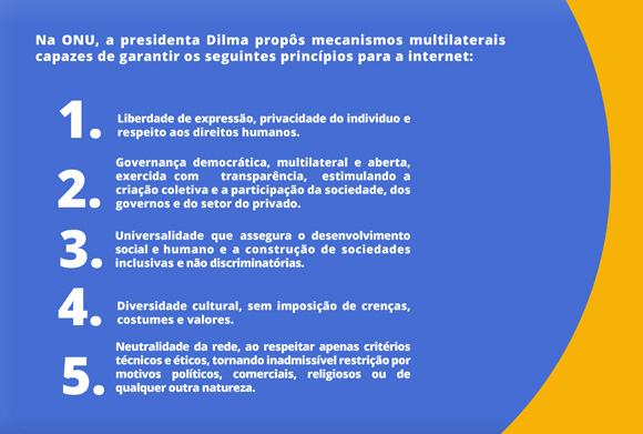 E propôs mecanismos multilaterais de governança e uso da internet e de efetiva proteção de dados. A presidenta do Brasil convocou a ONU a desempenhar o papel de liderança no esforço para regular o comportamento dos Estados frente a essas tecnologias: “Este é o momento de se criar as condições para evitar que o espaço cibernético seja instrumentalizado como arma de guerra, por meio da espionagem, da sabotagem, dos ataques contra sistemas e infraestrutura de outros países”, afirmou.
