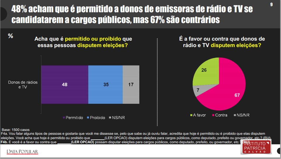 Da mesma forma que 64% são contrários a que apresentador de rádio e TV seja candidato, e 69% considera que ser dono de emissora aumenta a chance de se eleger. Entretanto, a maioria não sabe que a legislação eleitoral proíbe a candidatura de apresentadores/locutores em exercício, e 48% não sabem que é proibido “donos” de rádio e TV candidatar-se.
