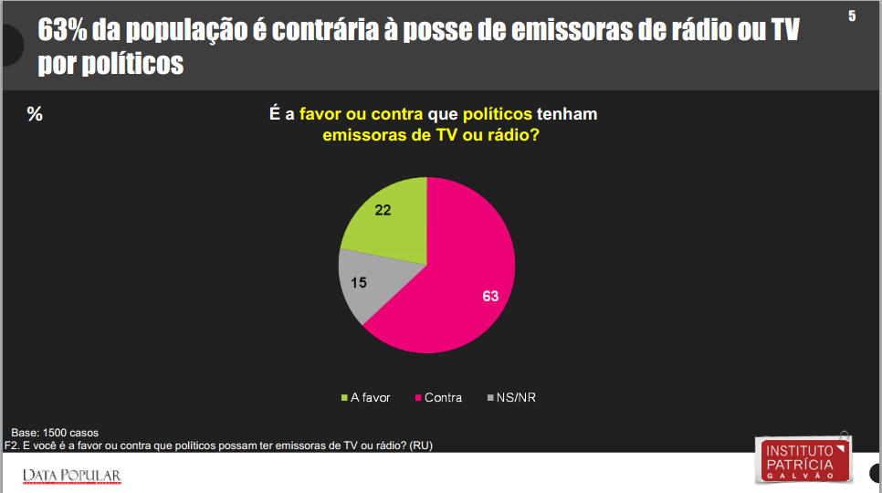Dentre as 1.500 pessoas ouvidas, homens e mulheres, em 50 municípios sorteados, 63% acham que político não deveria ter rádio e TV e 67% são contrários a que “donos” de rádio e TV possam ser candidatos a cargo público.