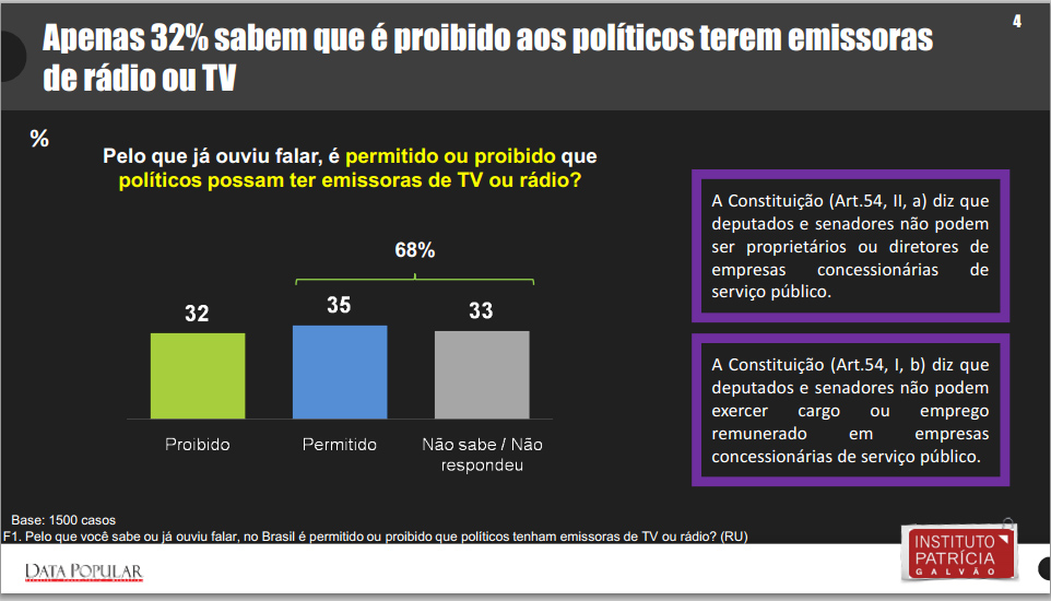 Entretanto, 33% não sabem que a Constituição Federal proíbe a posse de emissoras por políticos e 35% acham que é permitido. E 44% não sabem que rádio e televisão não são propriedade privada, mas concessão pública, outorgada pelo Executivo federal e submetida ao Congresso Nacional: 22% acham que basta ter dinheiro para adquirir uma emissora e 22% não souberam responder.