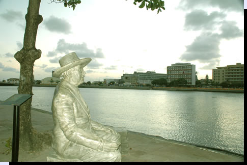 O poeta guarda as margens do Capibaribe, no Cais da Alfândega, no Recife Antigo – escultura de Demétrio Albuquerque – Foto capturada no sítio da PCR