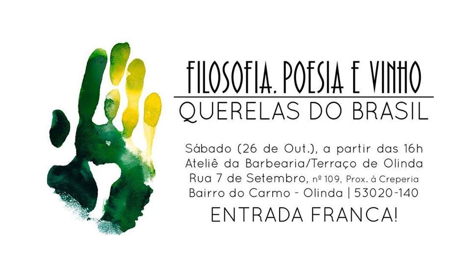 poesia e vinhoRecife e Olinda se revezam na arte do encantamento, cultura resvalando pelos poros abertos nos quatro cantos das cidades irmãs.  Hoje, a identidade brasileira está em evidência na abertura da V Edição do Filosofia Poesia e Vinho, com as Querelas do Brasil. A partir das 16 horas, no terraço do Ateliê da Barbearia, no Carmo.