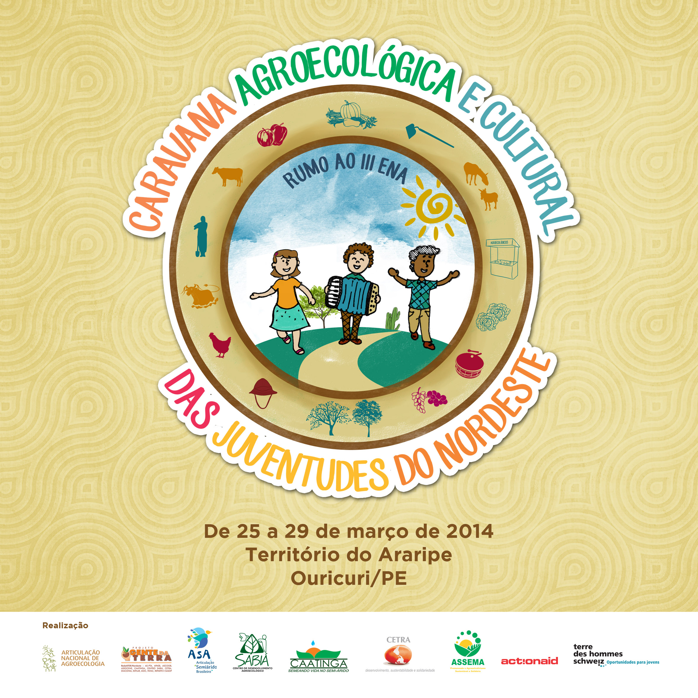 É a Caravana Agroecológica e Cultural das Juventudes do Nordeste – Rumo ao III Encontro Nacional de Agroecologia. O III ENA acontece de 16 a 19 de maio, em Juazeiro\BA e pretende reunir 2 mil pessoas para apresentar a agroecologia como alternativa concreta ao modelo agrícola hegemônico do agronegócio. O lema é Cuidar da Terra, Alimentar a Saúde, Cultivar o Futuro.