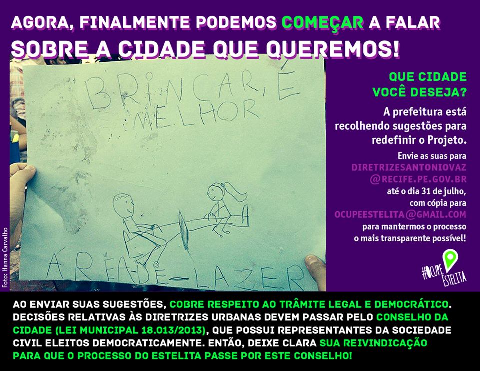 É a primeira vez, desde 2012, quando se inicio o Movimento #OcupeEstelita, que o poder municipal abre um canal de diálogo com a população. Dia 17 deste mês, tem nova audiência pública, quando, acredita-se, serão apresentados os resultados da consulta. Na mesmo local e hora do evento do mês passado: auditório da Fafire, de 14:00 às 17:00 horas.