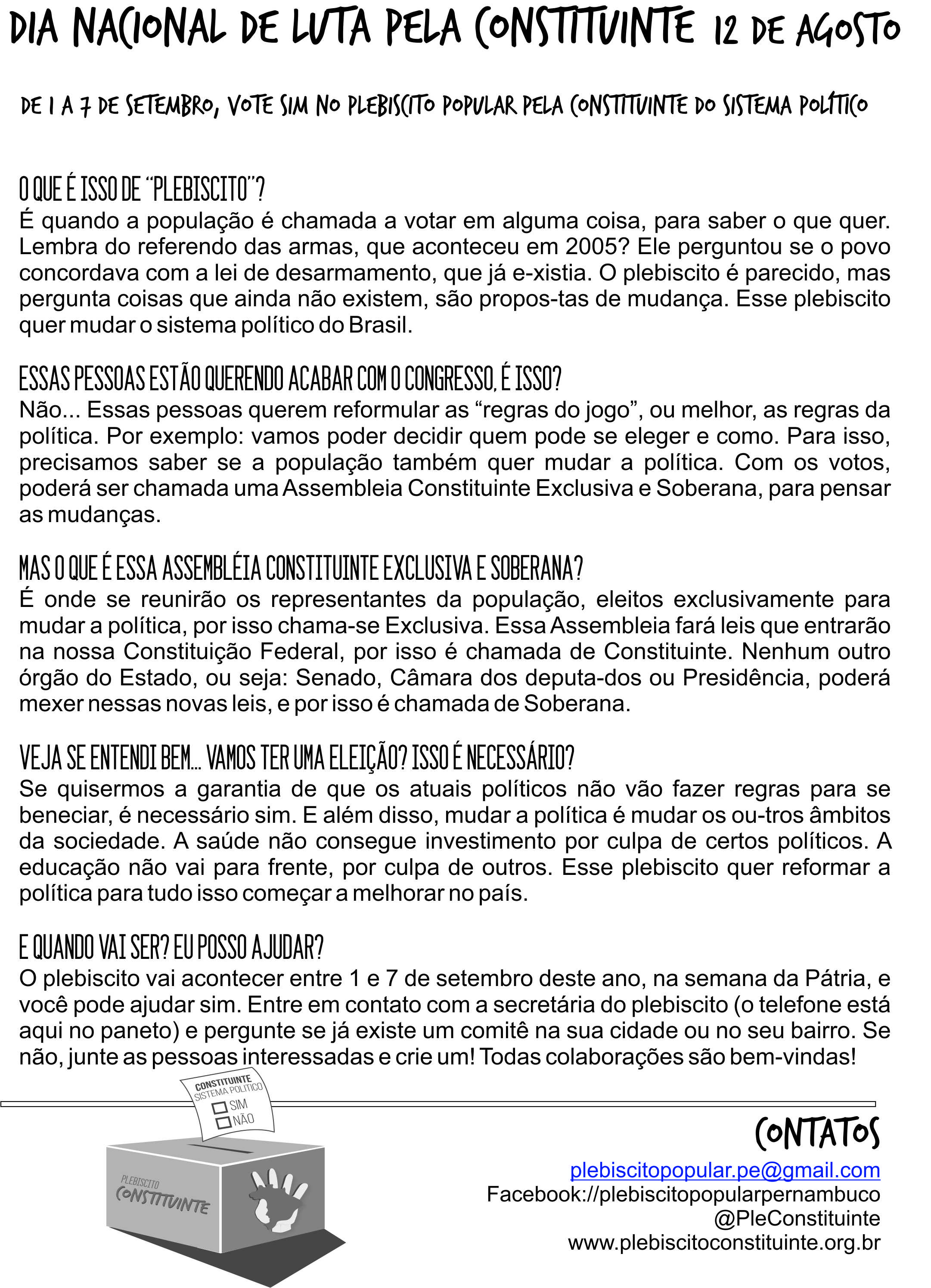 É Dia Nacional de Luta, o que no jargão do ativismo significa mobilizações em torno de um determinado objetivo. No caso, o SIM no plebiscito programado para a Semana da Pátria, de 01 a 07 de Setembro. É quando a população vai decidir se quer ou não uma assembleia nacional constituinte exclusiva para mudar as regras do jogo político no Brasil.