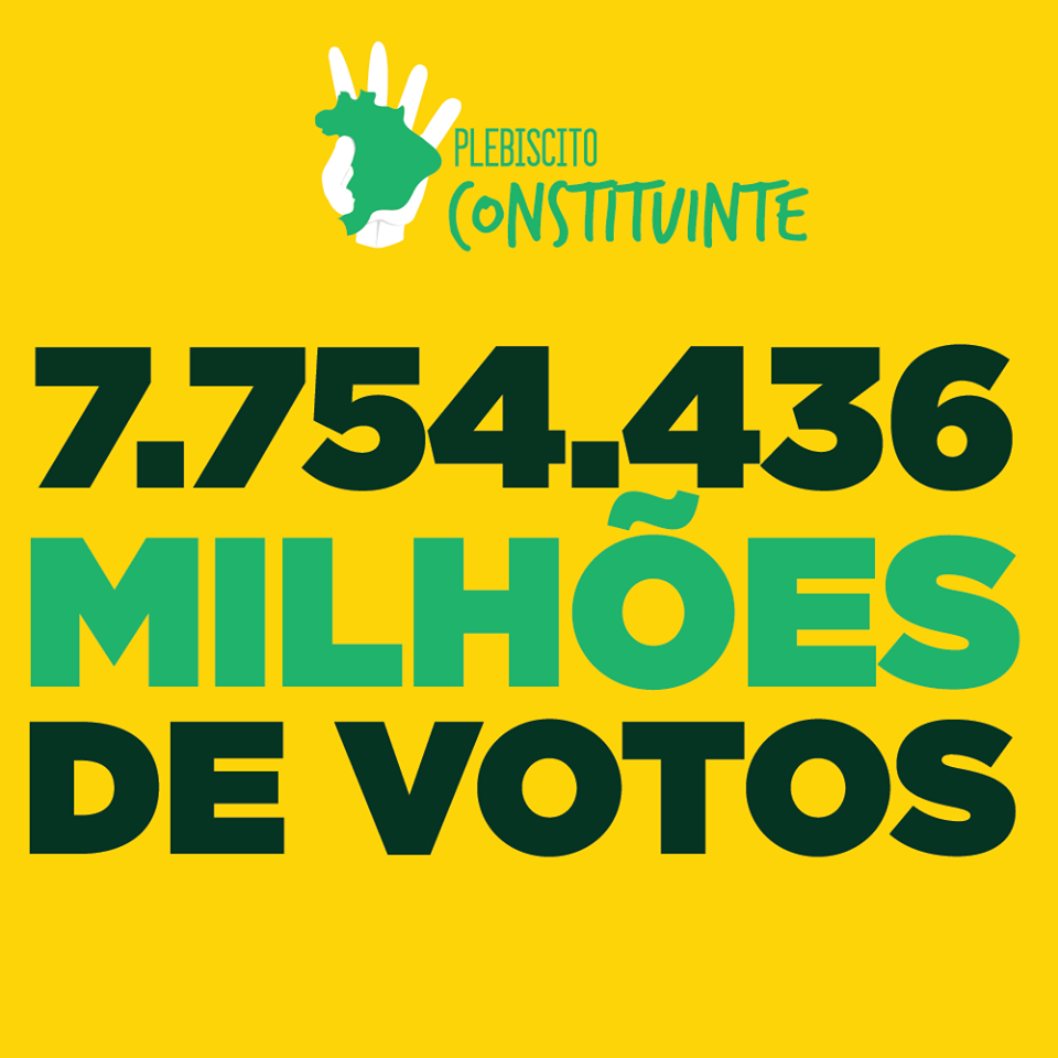 Cerca de 7 milhões e 400 mil brasileiros e brasileiras querem uma constituinte exclusiva para mudar o sistema político do país, apuradas 95% das urnas. Significa 97% dos 7 milhões e 754 mil 436 votos, 1,74 milhões dos quais via internet, colhidos no Plebiscito Constituinte, realizado durante a Semana da Pátria nos sete cantos do país.