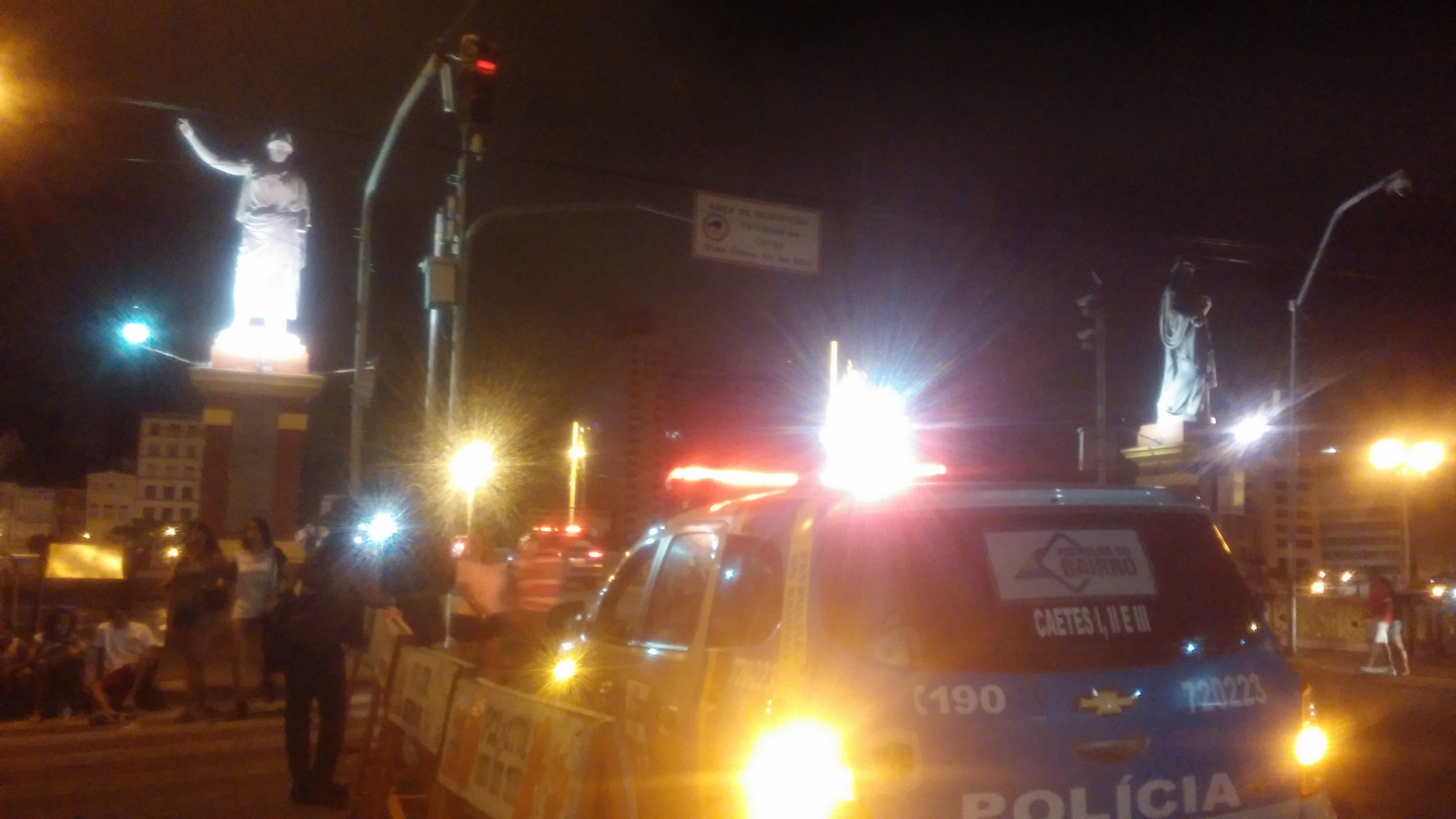 Seguimos os motoqueiros e damos a volta para retornar ao Marco pelo acesso principal. Lá, em frente ao posto policial contamos mais seis viaturas policiais e duas unidades do Choque, mais uma dúzia de PMs.