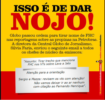 Quer um exemplo claro? Leia a denúncia que o colega Luís Nassif faz no seu GGN, reproduzido pelo Tijolaço: a mensagem da diretora de Jornalismo da Globo, Silvia Faria, aos editores da emissora, proibindo qualquer menção a FHC nas matérias relativas à Operação Lava Jato. Sim, o último delator de plantão confessou à PF que recebe propina desde 1997.