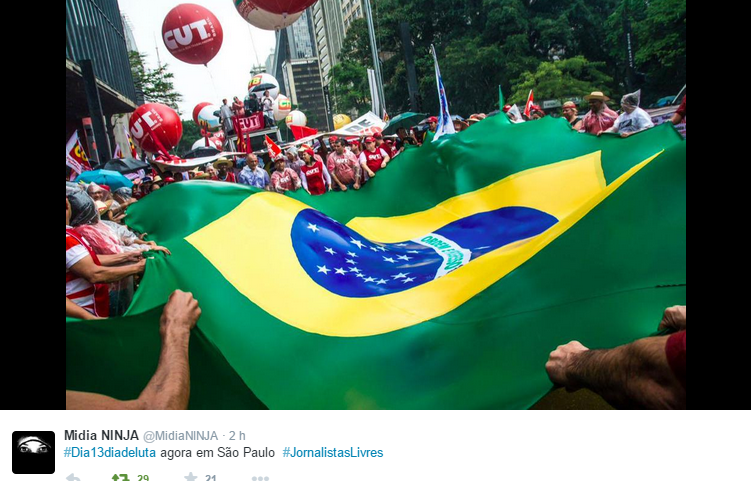 Acompanhei as manifestações Brasil afora pelo Twitter, pela transmissão ao vivo da Mídia Ninja, via Portal da CUT Nacional. A revista Fórum fez uma cobertura excelente, minuto a minuto, da manifestação em São Paulo. Entremeou com flashes do que rolou nas outras capitais. Arrasou. Renato Rovai e equipe estão de parabéns.