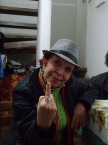 A inspiração: uma velhinha vitoriana, brandindo o dedo médio.
