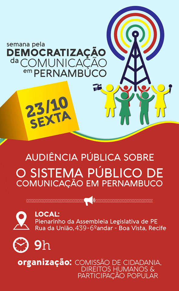 Ainda estamos na Semana Nacional pela Democracia na Comunicação. No Recife, as atividades se encerram nesta sexta, 23. Logo pela manhã tem audiência pública sobre sistema público de comunicação em Pernambuco, na Assembleia Legislativa. À noite, debate sobre o mesmo assunto em faculdade na vizinha Paulista.