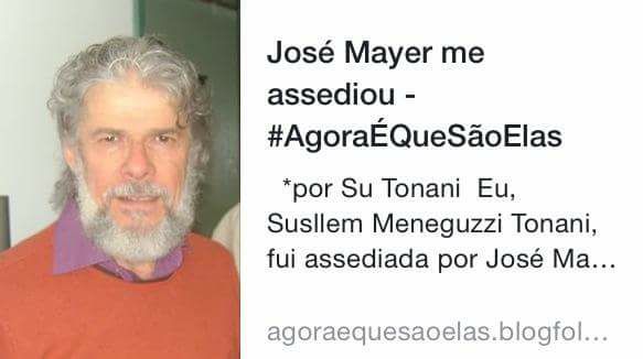 Trata do relato de uma figurista da TV Globo, Susllem Meneguzzi Tonani ou Su Tomani, sobre assédio de que foi alvo por parte do ator veterano, o mineiro José Mayer. Sim, aquele mesmo, que tem como marca o papel de garanhão. Pelo visto, interpreta a si mesmo.