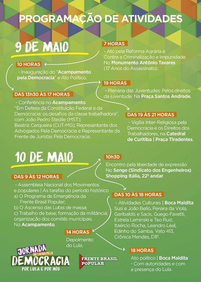 As atividades da Jornada da Democracia em Curitiba começaram na manhã deste 09 de maio, com a montagem do Acampamento da Democracia, e se encerram na noite da quarta-feira com ato político na tradicional Boca Maldita, no centro da cidade, com a presença de Lula, se tudo correr normalmente.