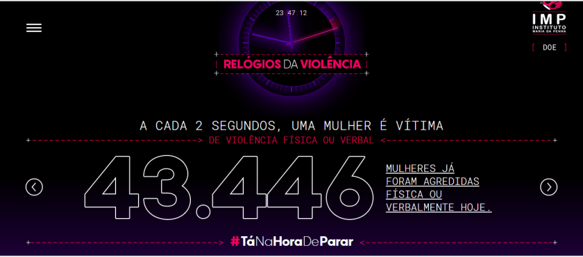 Importante ressaltar a campanha lançada pelo Instituto Maria da Penha, criado pela biomédica que dá nome à lei, para denunciar a violência física ou verbal contra as mulheres no Brasil. São os Relógios da Violência, que contabilizam diariamente o número de casos país afora – uma vítima a cada dois segundos.