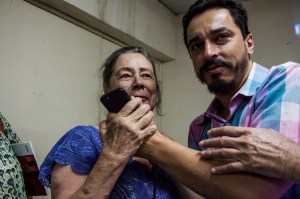 “Zé Diceu conversa com mulheres na Casa do Jornalista, na manhã do sábado 14/10. As bordadeiras do Grupo Linhas do Horizonte fizeram um bordado para ele.”
