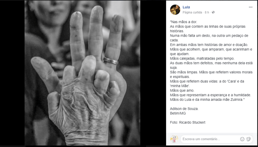 Obra do Ricardo Stuckert, um artista da lente, que abre esta postagem. Ao lado, um poema do mineiro Adilson de Souza, filho de Zulmira, a dona da outra mão.