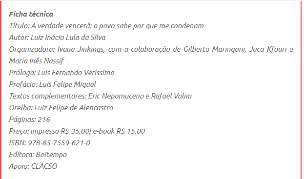 Acabo de reservar à Boitempo meu exemplar do livro A Verdade Vencerá: o povo sabe por que me condenam, de Luiz Inácio Lula da Silva. Campanha de pré-venda, disponível até o dia 16, data do lançamento oficial da obra, em São Paulo.