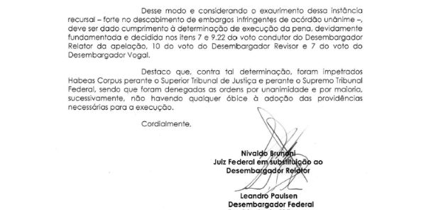 “Destaco que, contra tal determinação, foram impetrados Habeas Corpus perante o Superior Tribunal de Justiça e perante o Supremo Tribunal Federal, sendo que foram denegadas as ordens por unanimidade e por maioria, sucessivamente, não havendo qualquer óbice à adoção das providências necessárias para a execução”, informa o ofício, assinado pelo desembargador Leandro Paulsen, presidente da 8a. Turma do TRF-4 e pelo juiz Nivaldo Brunoni, que substitui João Pedro Gebran Neto, relator do processo em que Lula foi condenado a 12 anos e um mês.