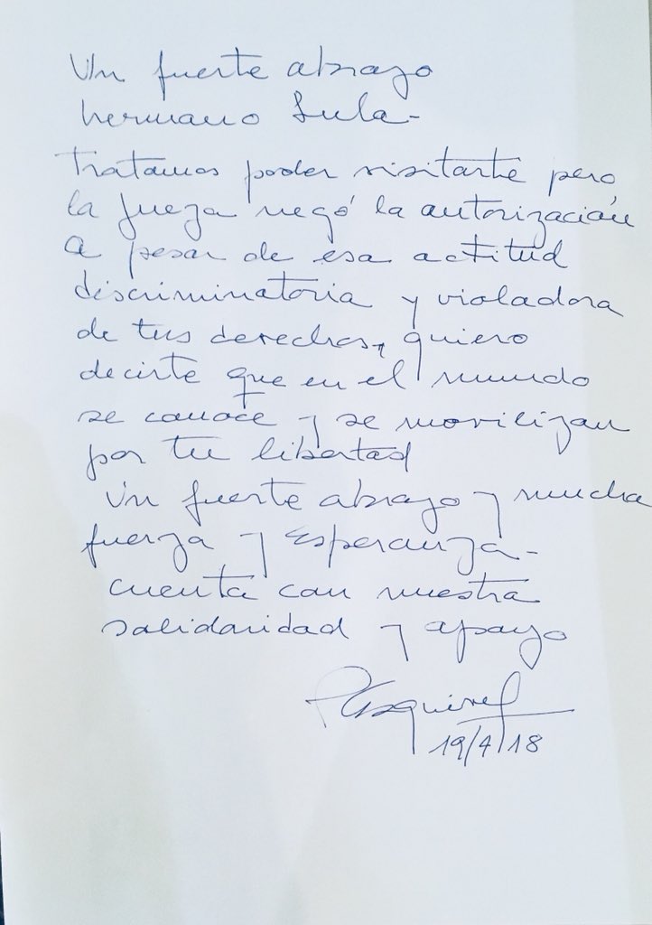 Em seu sítio na Internet, o ativista argentino publicou a carta que deixou para ser entregue a Lula, nesta quinta, impedido que foi pela juíza da Vara de Execuções Penais, de visitar o amigo. Mesmo sendo quem é, um Prêmio Nobel da Paz.