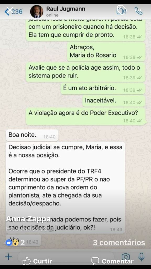 Como se não bastasse, até o ministro da Segurança Pública, a quem a Polícia Federal está subordinada, admite que o delegado curitibano seguiu ordens do presidente do TRF-4,. A deputada Maria do Rosário (PT-RS) divulgou a conversa que tiveram pelo zap-zap: