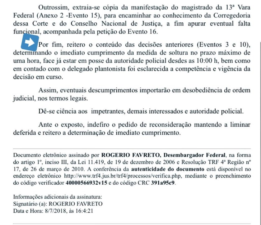 Note que Favreto diz que não foi “induzido” coisa alguma pela defesa do ex-presidente, reitera sua decisão e diz que o descumprimento importará em ilegalidade sujeita aos rigores da lei.