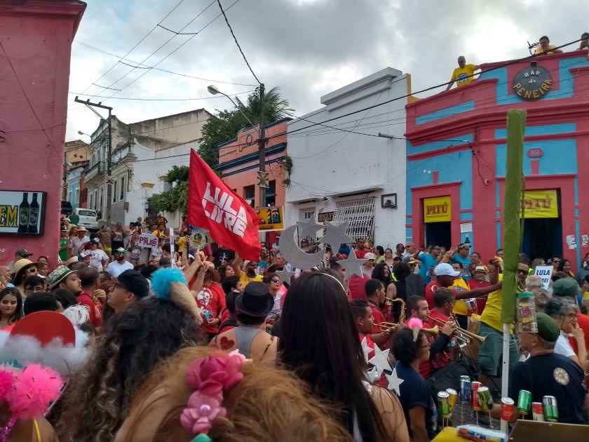 Tinha pouca gente na concentração e na saída dos blocos, mas a energia é contagiante e inescapável, de tudo que vem de e para Lula. E sítio histórico adentro, e ladeira acima e abaixo, foi juntando gente, e das sacadas, janelas e calçadas vinha apoio em gestos, aplausos e vozes: “Olê, olê, olê, olá, Lula, Lula!”