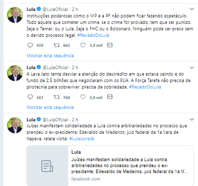 Lula usou as redes sociais par amandar o recado. Ele que nesta quinta recebeu visita de juizes federais que lhe manifestaram solidariedade contra sua prisão política, injusta e ilegal. Diz mais: