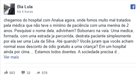 A mãe da criança, Maria Beatriz da Silva Sato Rosa, Bia Lula, denunciou o absurdo no Facebook.