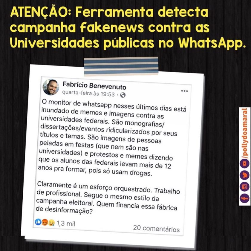 Ferramenta desenvolvida pelo professor Fabrício Benevenuto, pesquisador de Ciência da Computação da UFMG, detectou campanha ‘fake news’, notícias falsas contra as universidades públicas no WhatsApp. O alerta foi disparado pelo próprio pesquisador e divulgado na rede por uma parceira de ativismo feminista, pelos direitos sociais e pela democracia.